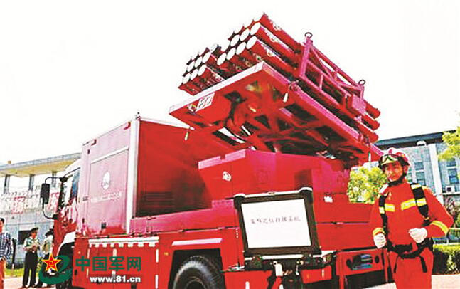這款投彈式高層建筑干粉消防車,是航天科工大名鼎鼎的“明星產品”,人稱“滅火導彈”,是一款通過發射滅火彈的方式來消滅高層建筑火災的特種消防裝備。它利用航天發射技術、控制技術和信息處理技術,能夠精確、快速、高效地撲滅高層樓宇火災。
